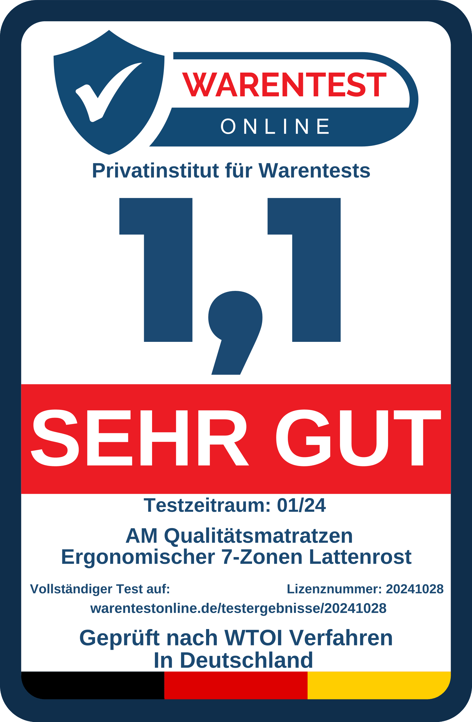 Von der Bestellung bis zur Lieferung hat alles 1A funktioniert. Der Lattenrost macht einen soliden Eindruck👍. Ich kann bis jetzt nichts negatives sagen. Ich war erst auch ein wenig skeptisch so etwas über das Internet zu bestellen aber die guten Bewertungen und die Möglichkeiten alles zu testen hat mich dann doch überzeugt. Kann AM Qualitätsmatratzen nur empfehlen👍👍👍.