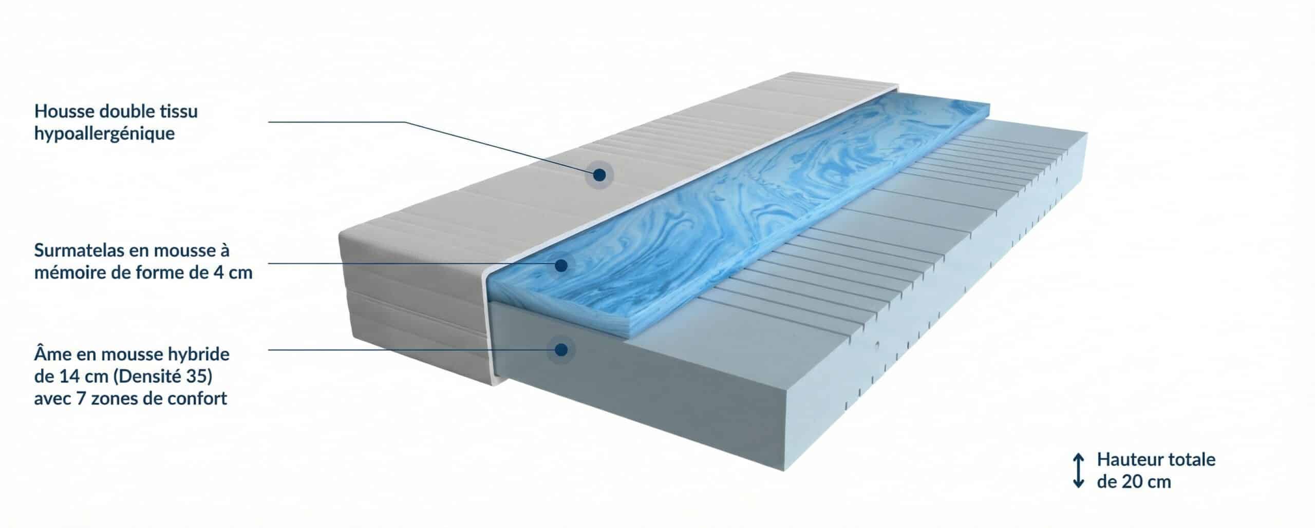 - Noyau en mousse hybride 7 zones (RG35) de 14 cm d'épaisseur avec découpe ergonomique des contours 2D