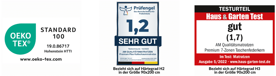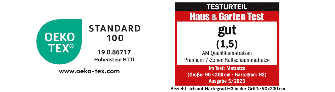 Unsere Tonnentaschenfederkernmatratzen sind Standard 100 by Oeko-Tex® zertifiziert (19.0.86717 Hohenstein HTTI). Alle verarbeiteten Materialien sind auf Schadstoffe geprüft und für Allergiker geeignet.